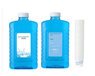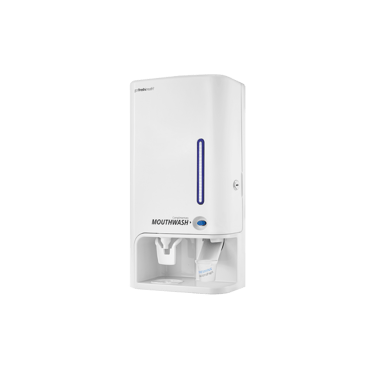 La válvula manual de la unidad está diseñada para dispensar 13 mililitros de enjuague bucal por uso. El dispensador tiene capacidad para una botella de 1,5 litros y 50 vasos a la vez. Cada botella es válida para 100 usos y el enjuague bucal se dispensa sin residuos ni suciedad. Esto se traduce en un gran ahorro de enjuague bucal en comparación con los dispensadores de bomba o decantadores tradicionales.